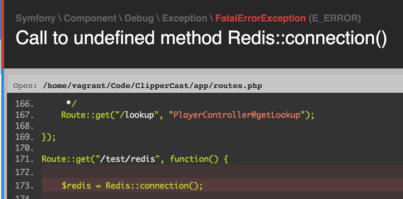 It's Thursday night, and you're looking to start using Redis in your Laravel application. You fire up your Homestead box (more on this in another post), open your favourite IDE and put in a new route to start playing around. Just something simple to start, write then read a value, just like the example.