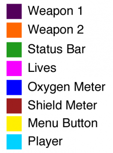 Although not shown explicitly, I've also considered the form of the oxygen and shield meters. Initially I considered a gauge design, in keeping with the underwater theme of the game. However, this may be difficult to read at the small sizes of the meters, so an alternative would be to have a "draining sphere" effect, with the apparent liquid level in the meters falling as oxygen/shield strength dropped. I intend to prototype both of these styles to make a final decision.