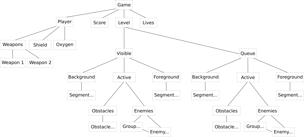 As previously discussed, the Visible and Queue trees can be divided into Background, Active objects and the Foreground. The background and foreground will be entirely graphical, so only need to consist of image segments (the ellipsis - ... - denoting collections of objects). The active objects can be divided into Obstacles, Enemies and Power-ups (not pictured - my oversight). Enemies may be grouped to create compound enemy types.