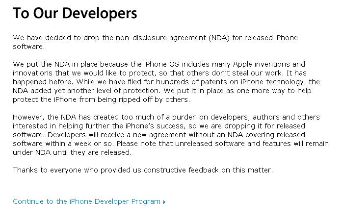 After opening the iPhone up to third-party developers, Apple has raised the ire of many a bedroom programmer by exercising what some might deem a draconian level of control over their App Store. Aside from complaints about (arguably unfairly) rejected applications, chief amongst developers' grievances is the highly restrictive NDA that effectively prevented anyone discussing the development process of their apps.