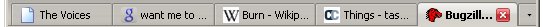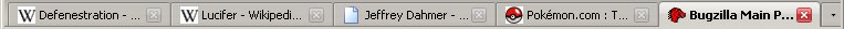 But hope is not lost, cubicle dwellers, there is a solution! Through subtle use of Firefox's tabbed browsing feature, you can plant subtle hints to pesky office inhabitants that you might be slightly unhinged. Think of every unsavoury and yet fascinating topic you can, and browse to a site proudly naming the topic in its title bar...Wikipedia is a goldmine for this. Look up murder techniques, famous assassins, obscure religions focusing on "the other guy", heavy rock bands with umlaut fetishes, anything that your average Joe would shy away from like a coconut.