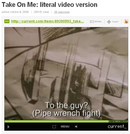 As is the case with many awesome videos, it has next to bugger all relation to the song itself (unless "Take on Me" is something you yell when you're coming at a cartoon Norwegian with a pipe wrench). Well, some ingenious soul decided to correct this mistake, and produced a version of the song more homogeneous with the images on screen. Click below for truthly goodness!