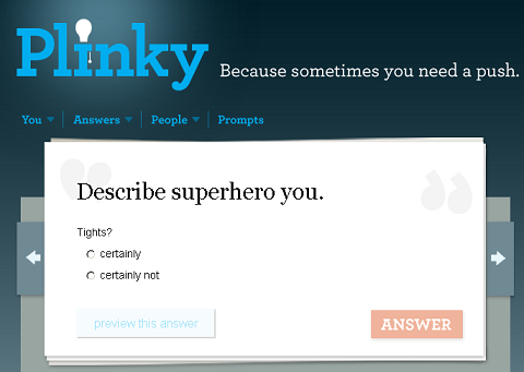 Plinky is a new take on short-form blogging services (like Twitter, Tumblr, etc), but with a twist. Instead of being presented with a totally blank text box - which to many writers is the scariest thing imaginable - you are given a question to help you get those creative juices flowing.